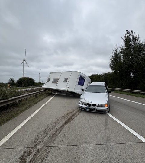 Ein 60-jähriger Loxstedter beabsichtigte mit seinem Pkw-Wohnanhänger-Gespann einen Lkw zu überholen. Hierbei kam der Wohnanhänger ins Schleudern, sodass sich das gesamte Gespann drehte, mit der Mittelschutzplanke kollidierte und anschließend auf der Fahrbahn zum Stehen kam. Der Fahrzeugführer und seine 57-jährige Beifahrerin blieben bei dem Unfall glücklicherweise unverletzt. Es entstand geringer Sachschaden am Pkw-Wohnanhänger-Gespann und der Mittelschutzplanke. Da das Gespann noch fahrbereit war, kam es nur kurzzeitig zu einer Sperrung der Fahrbahn.